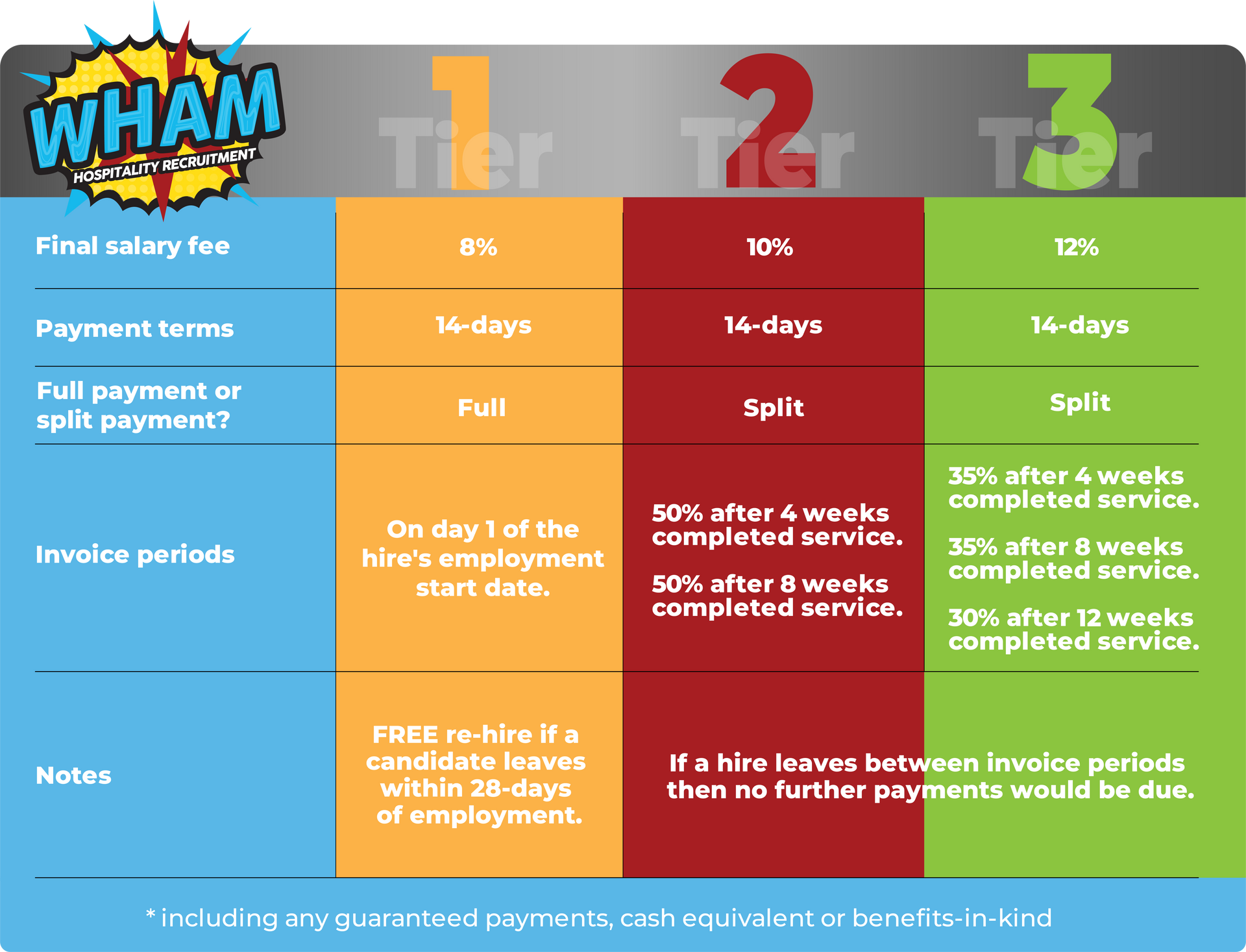 My pricing plans start from just 8% of the candidate’s final salary, making WHAM Hospitality Recruitment one of the most cost-effective, people-focused recruitment services in the sector.